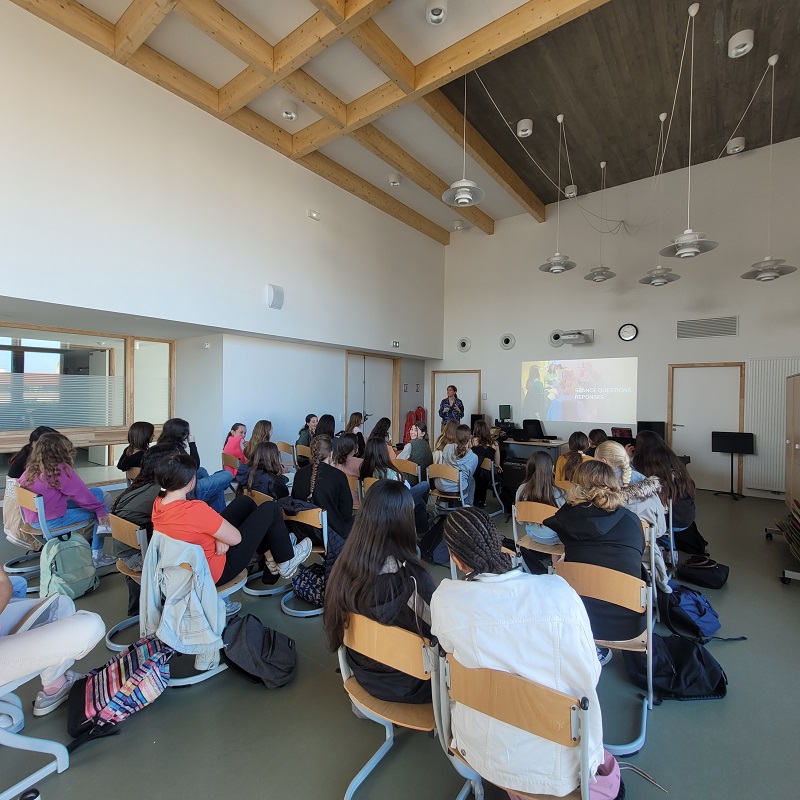 Les filles du niveau 5ème ont pu échanger ce vendredi 20 mars avec Isabelle Ithurritça, ingénieur de formation et actuellement Supply chain chez Safran, marraine de l’association « Elles bougent », sur son parcours professionnel en tant que femme dans un secteur très masculinisé.
