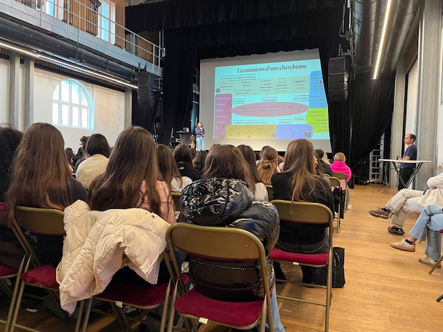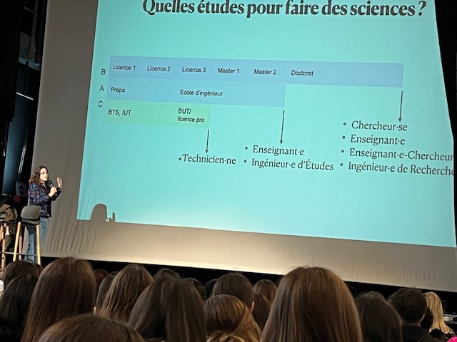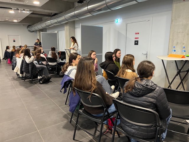 La journée s’est déroulée autour de plusieurs temps forts : une conférence menée par une chercheuse/ingénieure, suivie d’une pièce de théâtre sur les stéréotypes garçons/filles et les sciences. L’après-midi, en petits groupes, les élèves ont ensuite pu rencontrer des scientifiques de différents secteurs (technicienne, chercheuse, ingénieure, doctorante, étudiante…) qui ont chacune partagé avec les jeunes leur parcours, leur métier, leurs études.